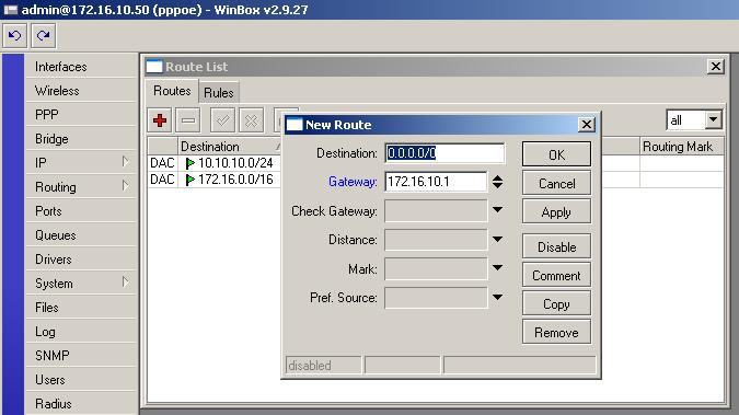 والان انتهينا من اعداد سيرفر ال(PPPOE) ولكن حتى هذه اللحظة لن يستطيع اي مستخدم الوصول الى الانترنت ما لم نضبط اعدادات المسار الافتراضي (default route) و تحويل عناوين الانترنت (network address translation NAT) وكما يلي: