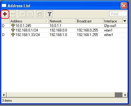 الخطوة الاولى وهي اضافة عناوين للمنافذ السلكية واللاسلكية وحسب نوع الجهاز وسبق ان تم شرحها حيث نذهب الى تبويب (IP) ثم الى (addresses) وننقر على اشارة (+) ونضيف عناوين المنفذ المحلي (للشبكة المحلية LAN) والمنفذ العالمي (للشبكة الخارجية اي لمصدر الانترنت WAN) وكما في الصورة التالية: