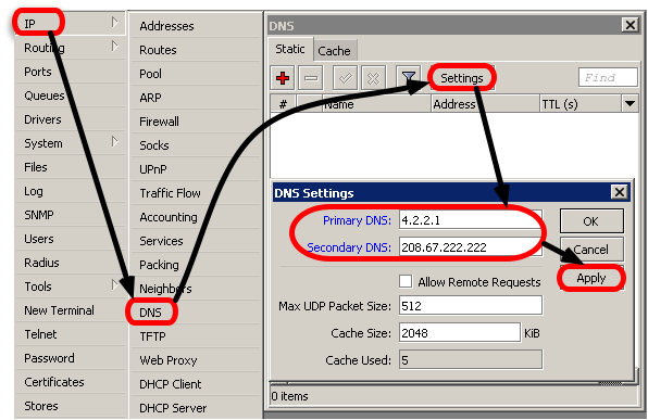 2- ضبط المايكروتك كخادم نظام اسماء المجال (DNS Server).