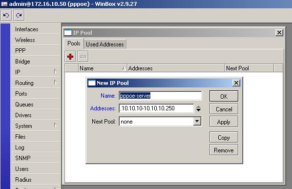 والان نخلق سيرفر ال (PPPOE) بالذهاب الى تبويب (PPP) ثم النقر على اشارة (+) فتظهر نافذة صغيرة فننقر على (apply) ثم (ok) وكما في النافذة التالية: