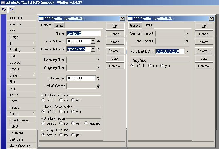 الان نقوم بأنشاء ملفات التخصيص (profiles) التي ستستخدم من قبل المستخدمين المختلفين وذلك بالنقر على زر (profiles) من نافذة ال (PPP) لتظهر نافذة كما في ادناه ونجد فيها نموذجين تلقائيين (two default profiles) ولا نقوم بالتلاعب بها وانما نقوم بخلق واحد جديد بالنقر على علامة الزائد لتظهر نافذة نحدد فيها اسم البروفايل الجديد وليكن اي اسم معبر وهو في المثال (profile512) ويكون العنوان المحلي (local address) هو عنوان المنفذ المحلي للسيرفر او عنوان منفذ ال (LAN) واما عنوان ال (Remote address) فهو لحوض العناوين الذي خلقناه في الخوة الاولى من اعدادات ال (PPPOE) والذي سميناه (PPPOE-server) ونستطيع اختياره بالنقر على السهم المثلث او كتابة الاسم باليد اما عنوان ال (DNS server) فهو نفس العنوان الذي ضبطناه سابقاً ثم ننقر على تبويب (limits) كما في الصورة ادناه ونحدد الحد الاعلى للأرسال والاستقبال (tx/rx) وليكن (512 KB) كما في الصورة وحسب عرض نطاق الشبكة الكلية وعدد المستخدمين: