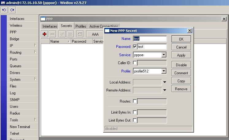 والان نصل الى مرحلة خلق المستخدمين وذلك بالذهاب الى تبويب (secrets) ثم النقر على علامة الزائد (+) لأضافة مستخدم جديد وفي حقل (name) نضع اسم معرف للمستخدم وهنا سميناه (test) وهو اسم المستخدم في الطرف الاخر من الشبكة واما كلمة المرور (password) فهي في هذه الحالة (test) ايضاً وهما المعلومتان التان يجب اعطائهما للمستخدم ليقوم بخلق اتصال من نوع (broadband) في حاسبته المتصلة بالشبكة سلكياً او لاسلكياً. وفي خانة الخدمة (service) نضع (PPPOE) وهو نوعية الخدمة التي ننوي تقديمها لهذا المستخدم وفي حقل البروفايل نختار البروفايل الذي خلقناه قبل قليل (profile512) ولا نغير اي شيء اخر ثم ننقر على (apply) ثم (ok) وكما في النافذة التالية:
