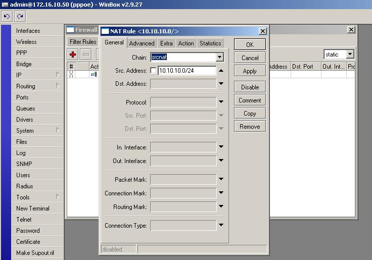بالنسبة للنات نذهب الى (IP) ثم (Firewall) ثم من تبويب (NAT) نختار اضافة (net firewall rule) بالضغط على علامة الزائد وبالاعدادات التالية: (chain=srcnat , src.address=10.10.10.0/24) ثم نذهب الى تبويب (action) من نفس النافذة ونختار (action=masquerade) لأخفاء اسم الشبكة وعدم القدرة على الارتباط بها الا من قبل الروتروات من نوع مايكروتك في الطرف الاخر وحسب اعداداتنا التي نعرفها لوحدنا لمنع الاختراق ثم (Apply) ثم (ok).